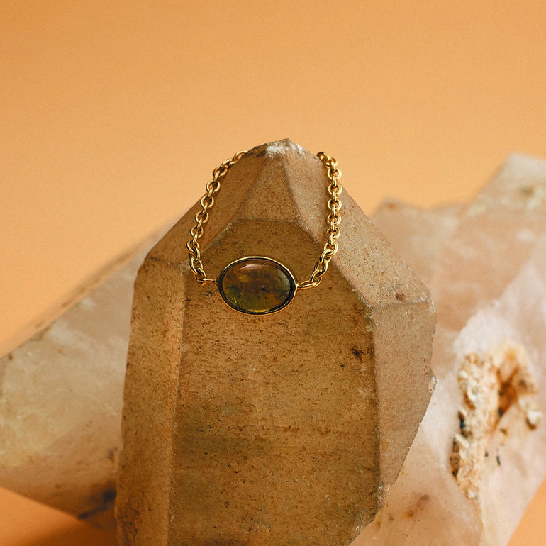 La bague Chaîne Léa associe l’éclat naturel d’une tourmaline cabochon à la finesse d’une chaîne forçat en or 18 carats.
