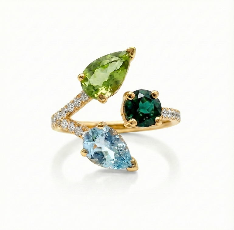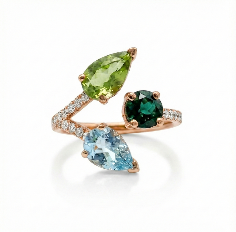 Pensée comme une pièce unique, la Bague Laetitia associe l’éclat subtil de deux Tourmalines facettées (taille ronde et poire) à la lumière cristalline d’une Aigue-marine poire dans une composition asymétrique audacieuse. Son design sculptural est sublimé par un corps de bague en or rose 18 carats (750/1000), entièrement micro-serti de diamants taille brillant qui apportent une luminosité précieuse à chaque mouvement de la main.